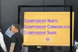 队记晒湖人训练营场边标语:冠军习惯 冠军沟通 冠军状态