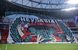 此前,浦和红钻就以内容丰富、面积巨大的Tifo文化著称,被称为“亚洲第一主场”。3月和6月的18强赛,印尼队在容量7.7万人的雅加达球场展示了巨大Tifo,文化输出方面同样令人印象深刻:对巴林时Tifo画面是象征印尼民族传统文化的金色迦楼罗神鸟,整个Tifo覆盖了两层看台;对国足时Tifo展现的是印尼神话英雄迦多铎卡伽形象,他左手持绘有迦楼罗的盾牌,右手舞刀冲破城堡,象征印尼的强大力量。