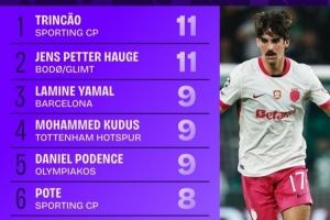 本赛季欧冠完成过人榜:特林康和海于格11次分列前二,亚马尔第三